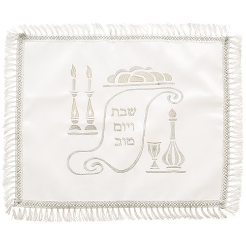כיסוי חלה לבן מסטן עם ריקמה מרובעת "שבת ויום טו