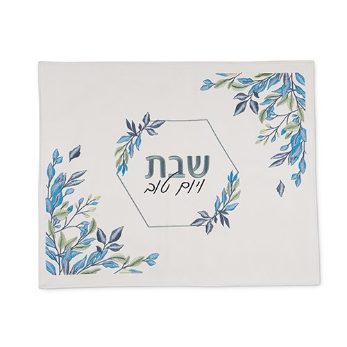 כיסוי חלה לבן מסטן עם ריקמה מלבנית "שבת ויום טו