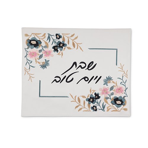 כיסוי חלה לבן מסטן עם ריקמה מלבנית "שבת ויום טו