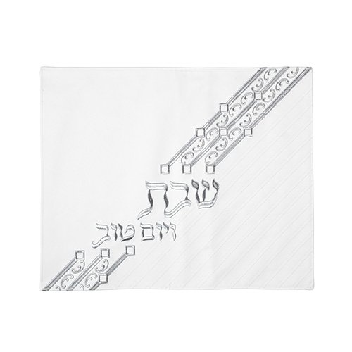 כיסוי חלה לבן מסטן עם ריקמה מרובעת "שבת ויום טו