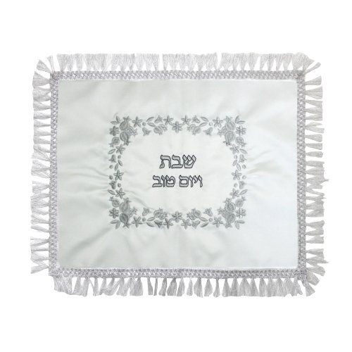 כיסוי חלה לבן מסטן עם ריקמה אובלית "שבת ויום טו