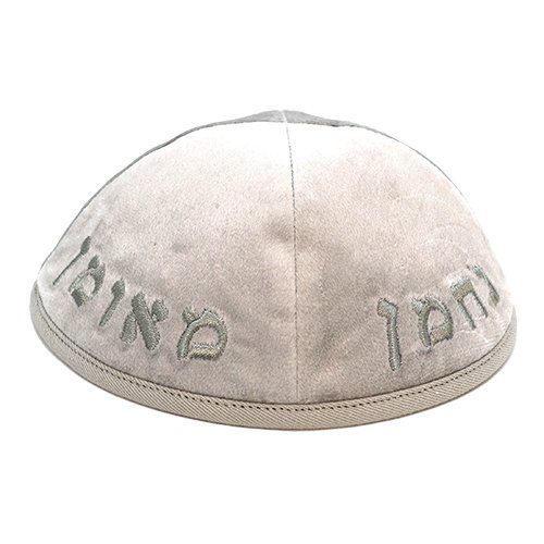 כיפה ארטמן קטיפה נחמן אפור עם רקמה חול בהיר גודל 4
