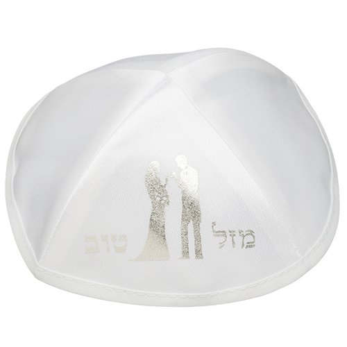 כיפה סטן לבנה 19 ס"מ הדפסה כסף "מזל טוב" חתן כלה