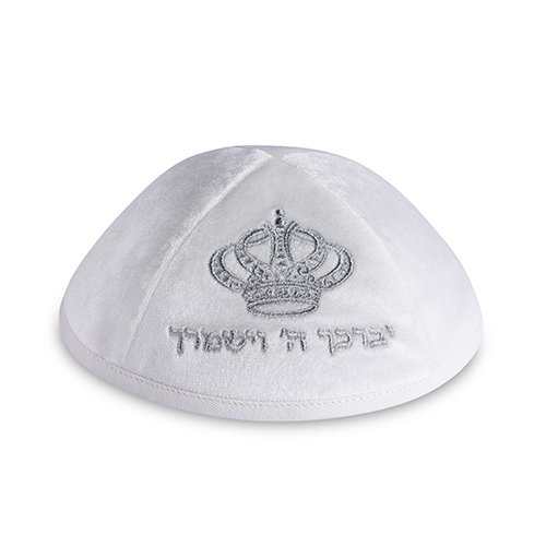 כיפה קטיפה "ארט-מן" עם ריקמה יברכך גודל 4 – לבן