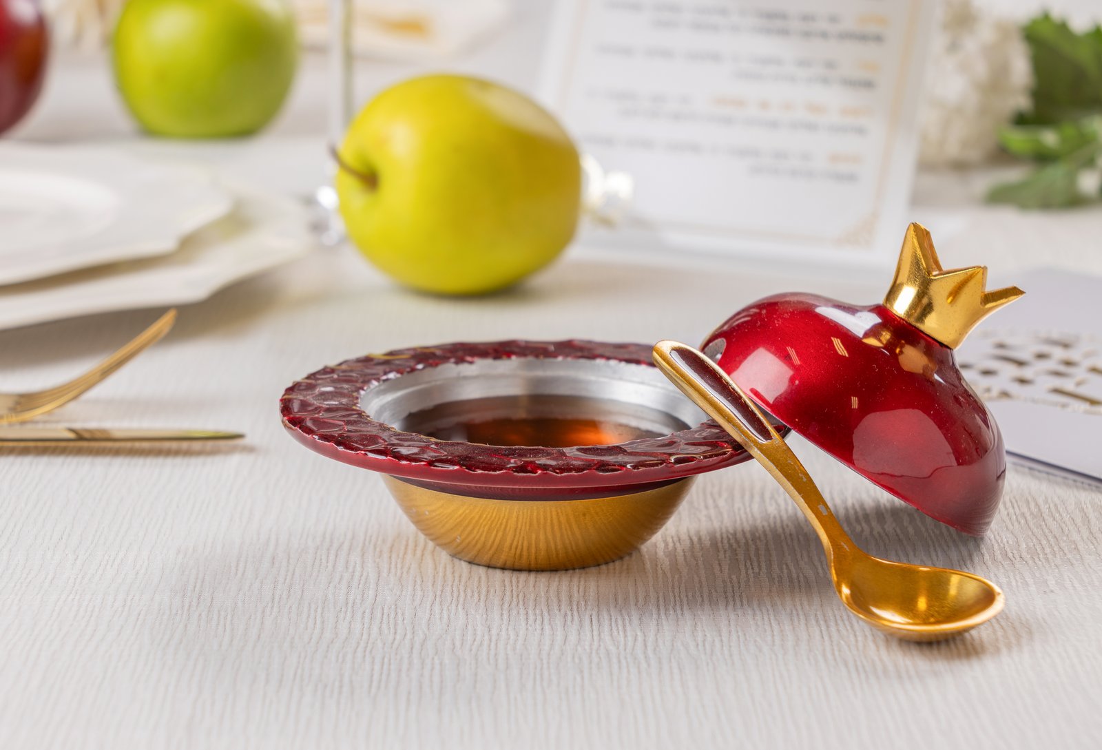 כלי מהודר לדבש עם כפית מאלומיניום בצורת רימון 12×8 ס"מ