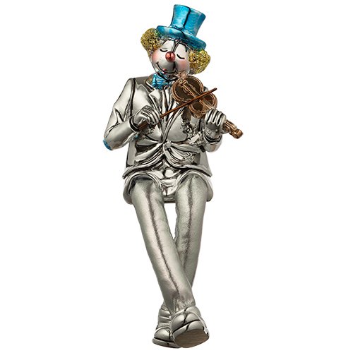 ליצן יושב מפוליריזן מוכסף עם רגלי בד כסף מנגן ב
