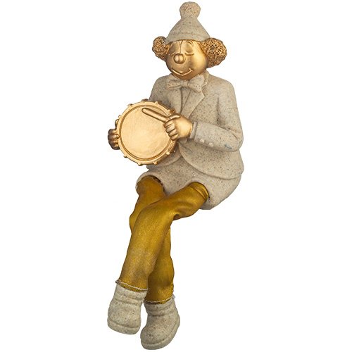 ליצן יושב מפוליריזן עם רגלי בד כסף מנגן בתוף