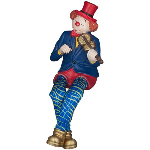 ליצן יושב מפוליריזן צבעוני עם רגלי בד כסף מנגן בכינור