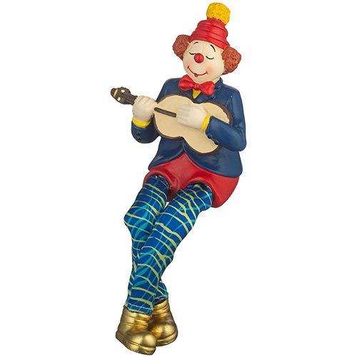 ליצן יושב מפוליריזן צבעוני עם רגלי בד מנגן בגיטרה