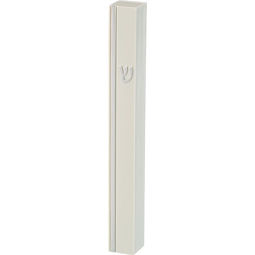 מזוזה פלסטיק לבנה 12 ס"מ "ש" כסף ופס כסף עם פקק גומי