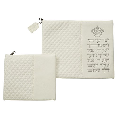 סט טלית תפילין דמוי עור לבן אותיות בולטות "ויברכך"