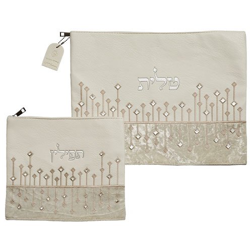 סט טלית תפילין דמוי עור לבן אותיות בולטות כסף 36*29 ס"מ