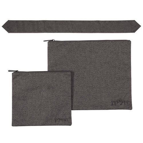 סט טלית תפילין רש"י-תם דמוי עור שחור ואפור עם ריקמה 38*41 ס"מ