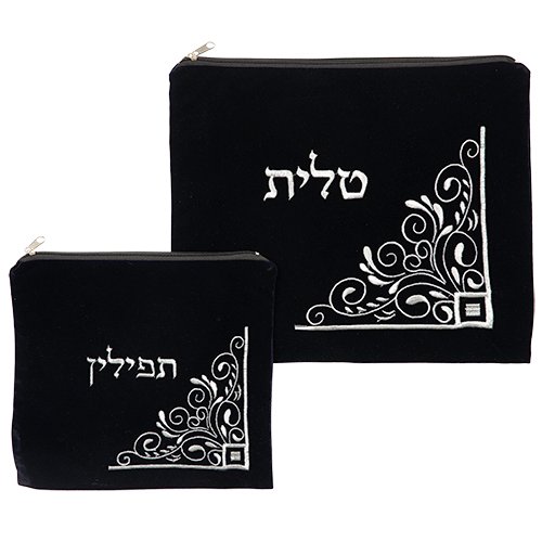 סט טלית תפילין רש"י-תם דמוי עור שחור ואפור עם ריקמה 38*41 ס"מ