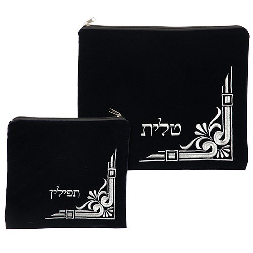סט טלית תפילין דמוי עור אפור "כותל" עם הבלטה "