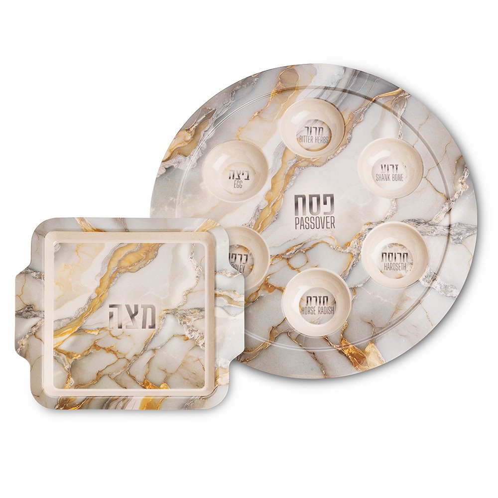 סט קערת פסח ומצה במבוק דמוי שיש זהב