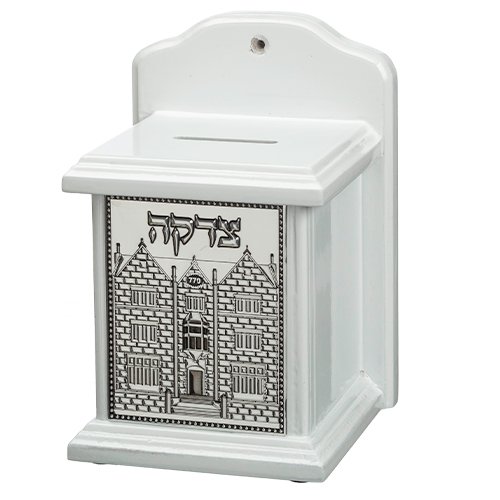 קופת צדקה עץ לבנה מהודרת עם פלקטה "עיטורים" 11×15 ס"מ
