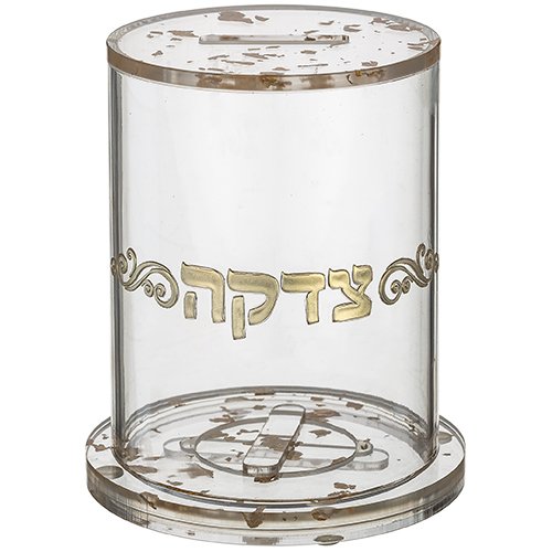 קופת צדקה פרספקס עם הדפסה – נצנצים זהב 13 ס"מ