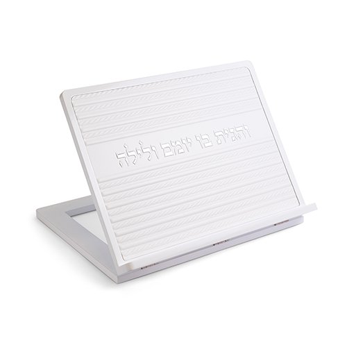 שטנדר מעץ לבן עם פלקטה דמוי עור ואותיות בולטות 38×30 ס"מ