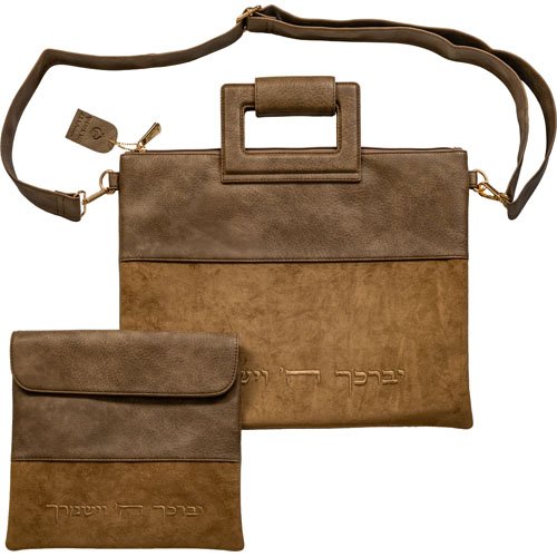 כמות של תיק טלית תפילין מהודר דמוי עור חום בהיר רקמה יברכך 3831סמ